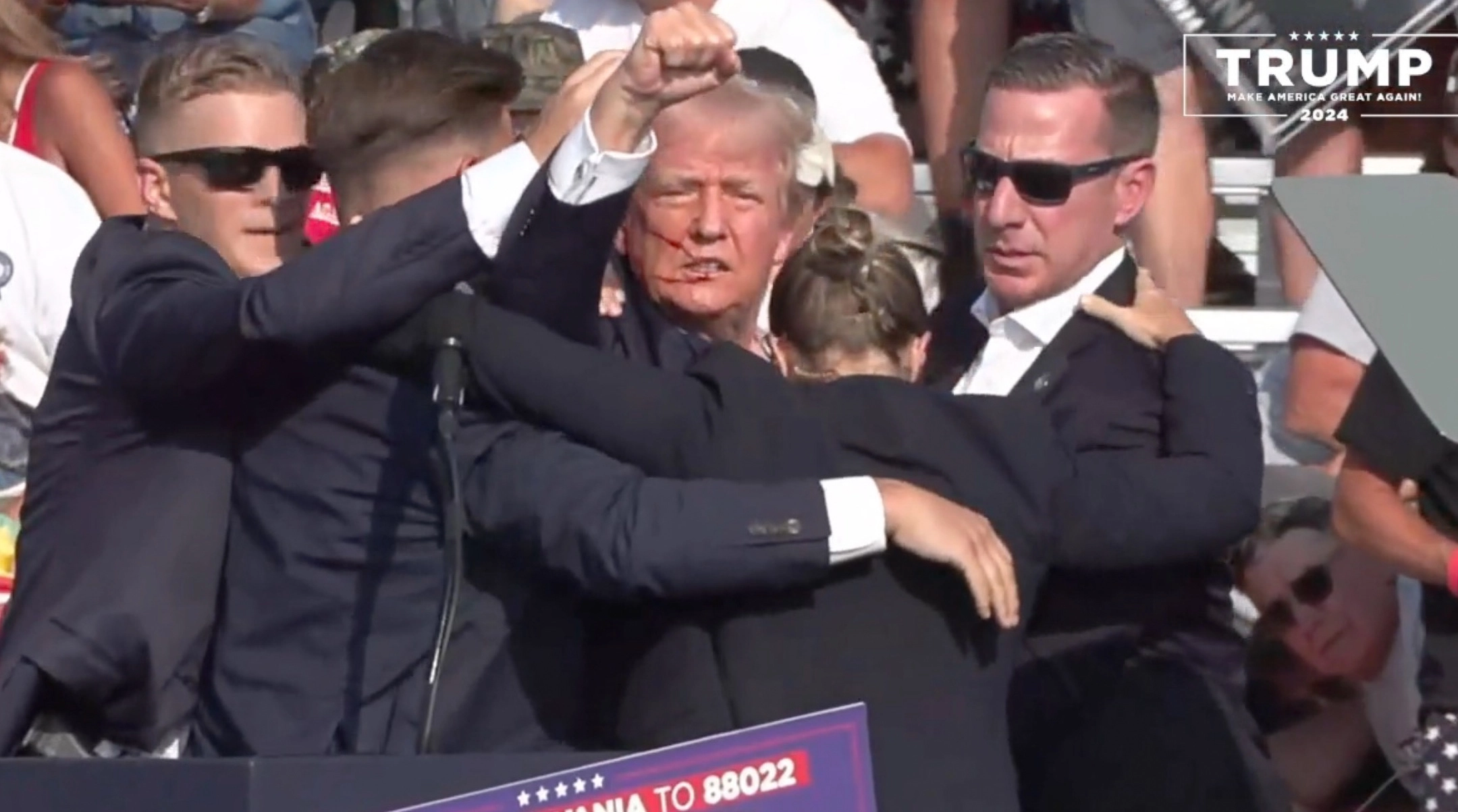 In a screen grab captured from a video, Republican presidential candidate and former President Donald Trump appears to be injured after gunshots were reported at a rally in Butler, Pennsylvania, July 13, 2024. (Anadolu/Getty Images)