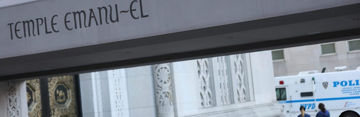 NYPD Mobile Command Center trucks are stationed near Temple Emanu-El on March 13, 2026 in New York City. (Michael M. Santiago/Getty Images)